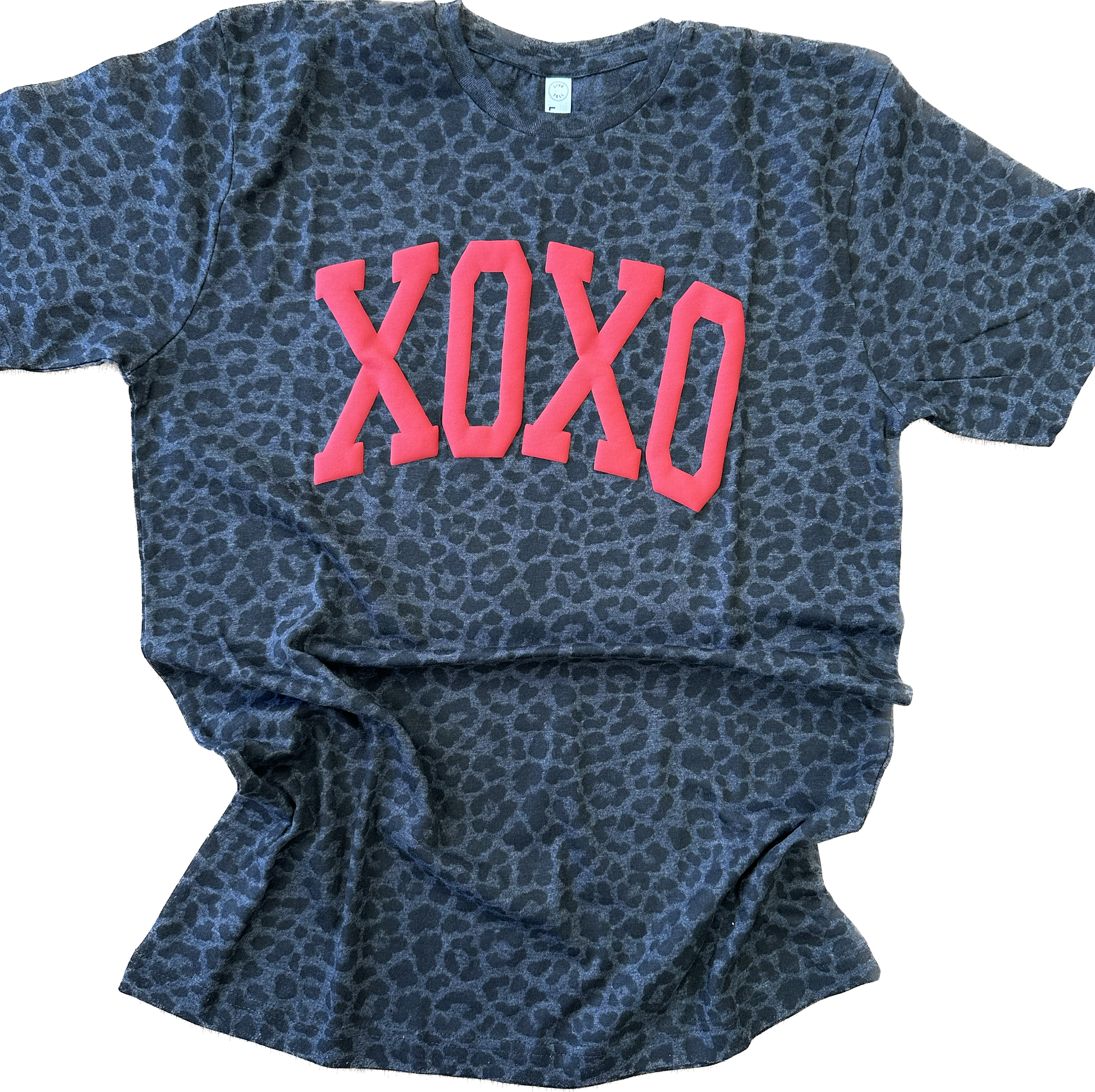 XOXO in red puff on leopard t-shirt.